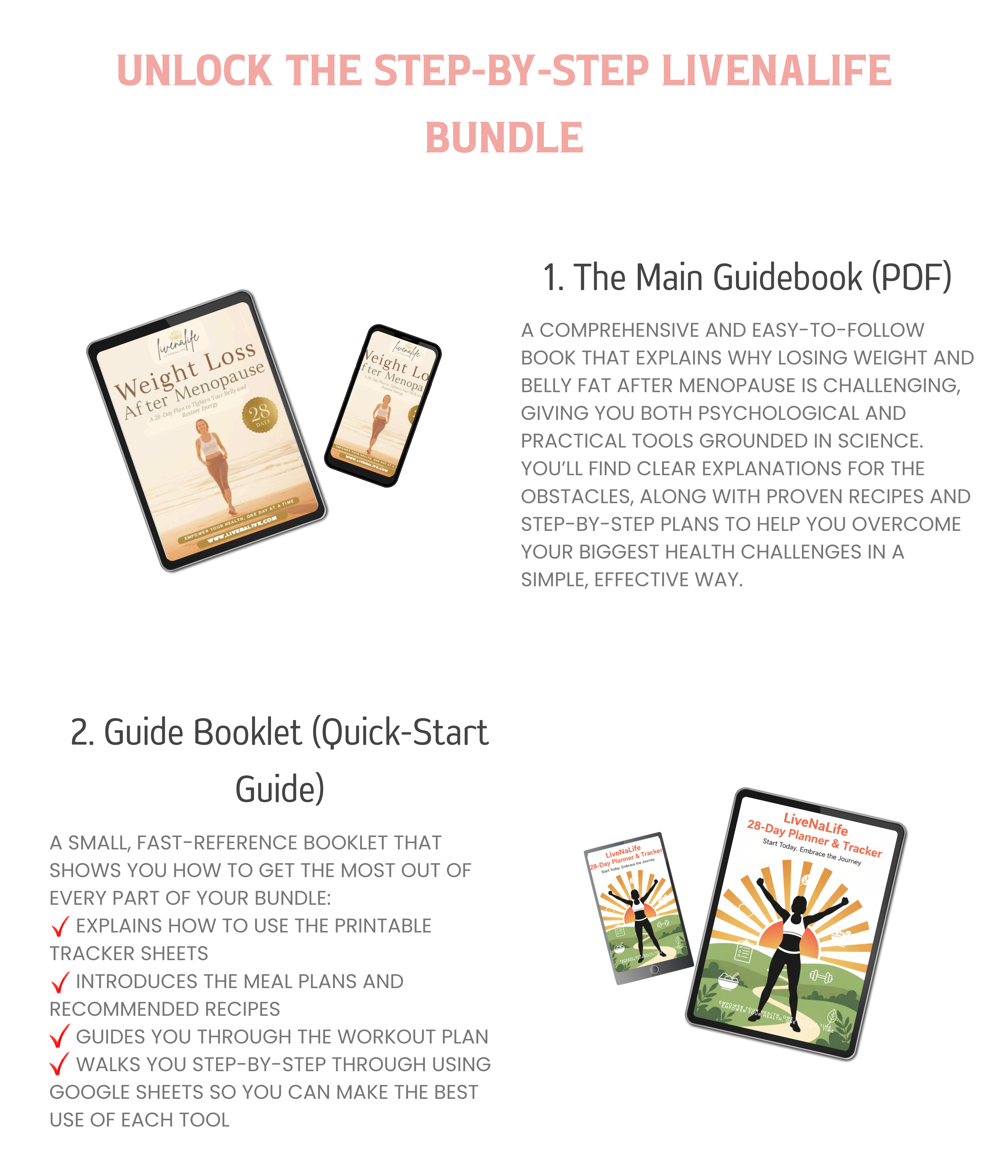 LiveNaLife is the result of those years of experiments, recipes, trackers, and coaching sessions with real women—women who wanted something gentler and smarter than another strict workout schedule. It’s not just a diet plan; it’s a step‑by‑step system designed so you never have to walk this stage of life alone again.